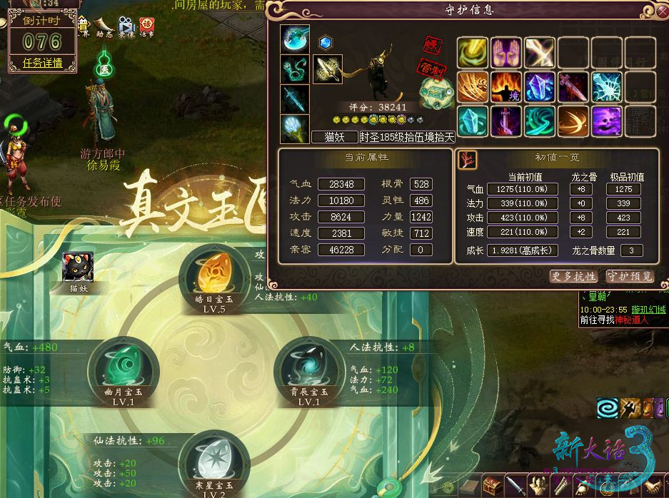 | 万物500多血吧 宝玉720血吧 初值比你高343那就是多接近1000血 剩下的四象可不能不算啊500多根骨能多好多血呢 然后就是六脉 然后就是坐骑 坐骑能差很多 还有就是人家的九星石加不加血不知道 万妖塔等级也不知道 |