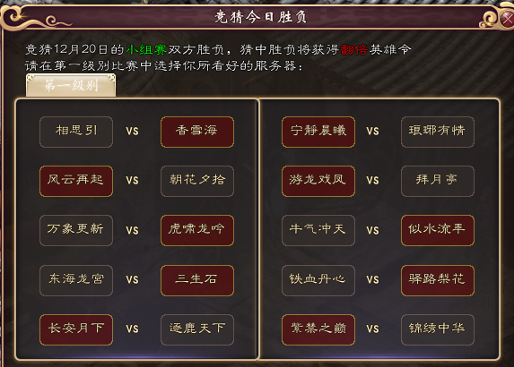 比较有看点是风云对朝花,万象对虎啸,宁静对琅琊。